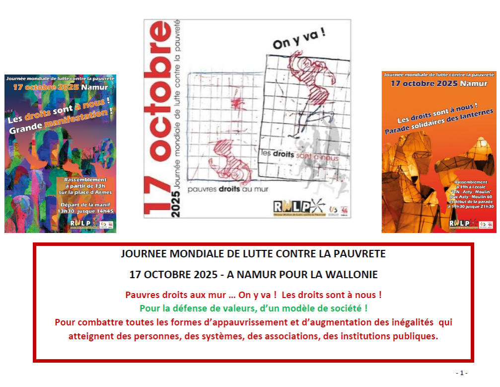 - A 13h30 (jusque environ 15h), départ pour la grande manifestation « Les droits sont à nous ! On y va… » dans les rues de Namur. Le circuit ne sera pas très long, rassurez-vous. Il sera émaillé de stands-animation qui porteront sur les droits attaqués aujourd’hui comme le droit du travail, les droits dans le giron de la sécurité sociale comme la santé, le chômage, les pensions, le droit au logement, etc.
