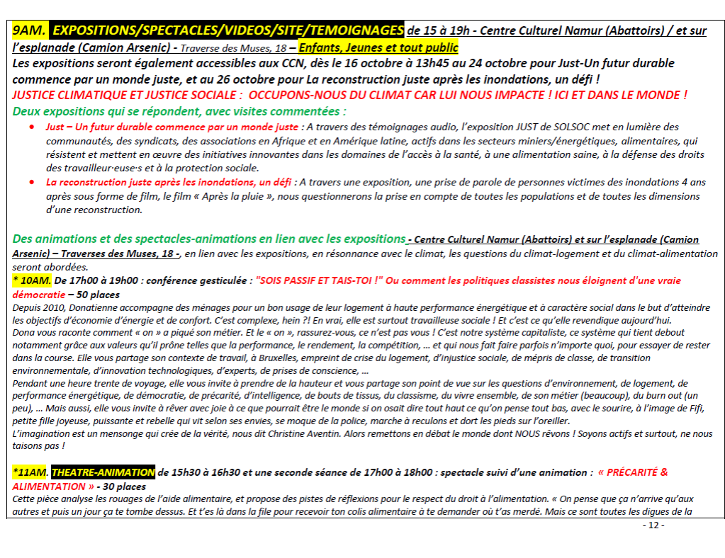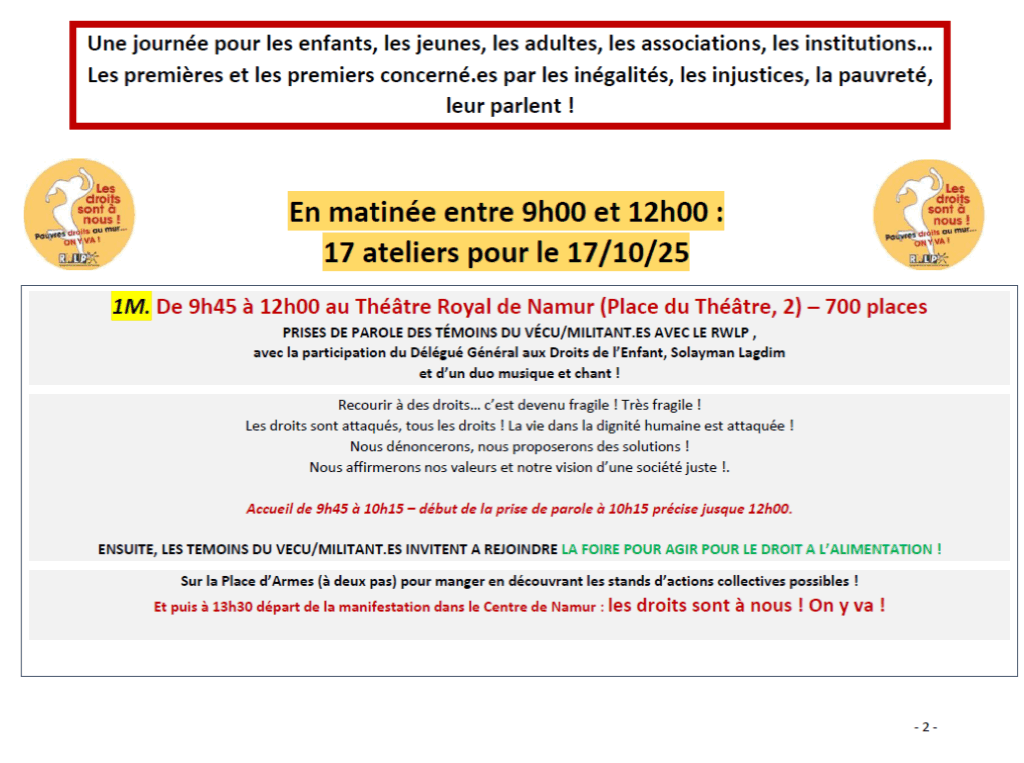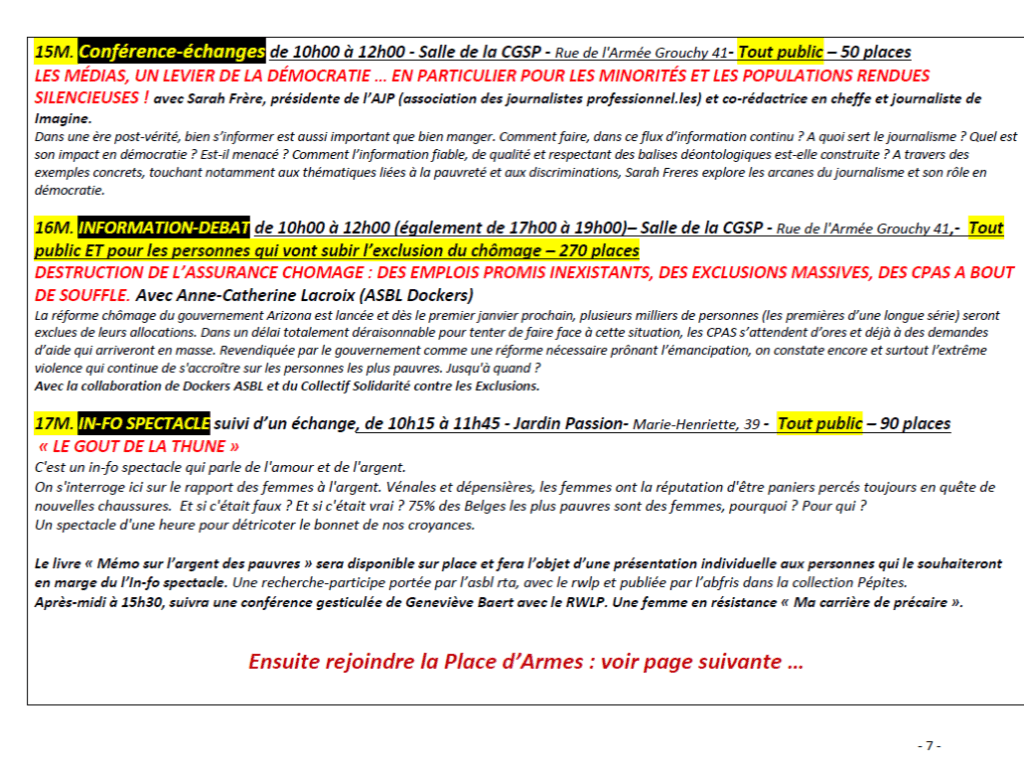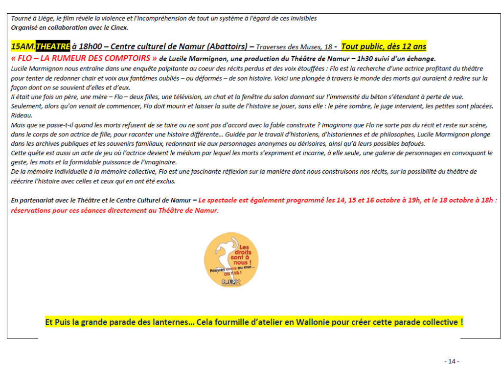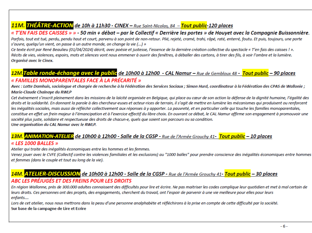 - En matinée, entre 9h30 et 12h15 : un ensemble d’ateliers, conférences-débats, expositions films et spectacles débats, ainsi que la prise de parole des témoins du vécu/militant.es sont organisées dans plusieurs salles et lieux à Namur.