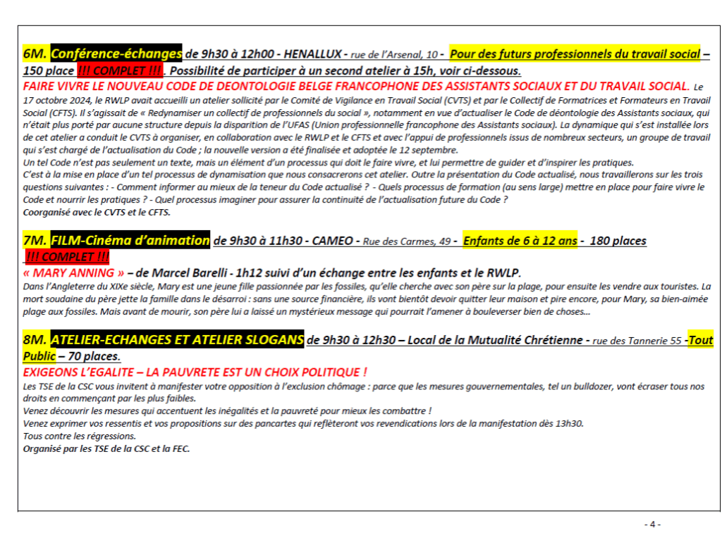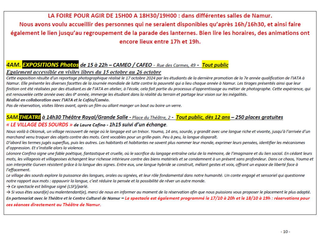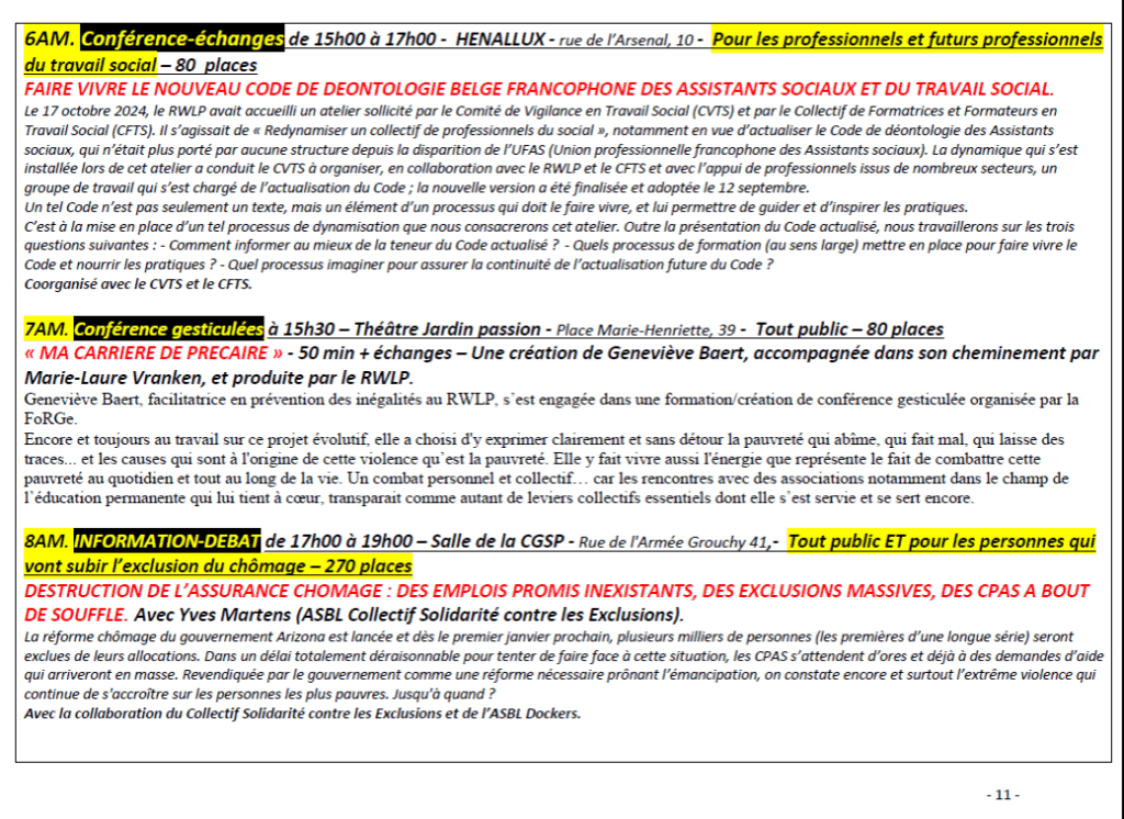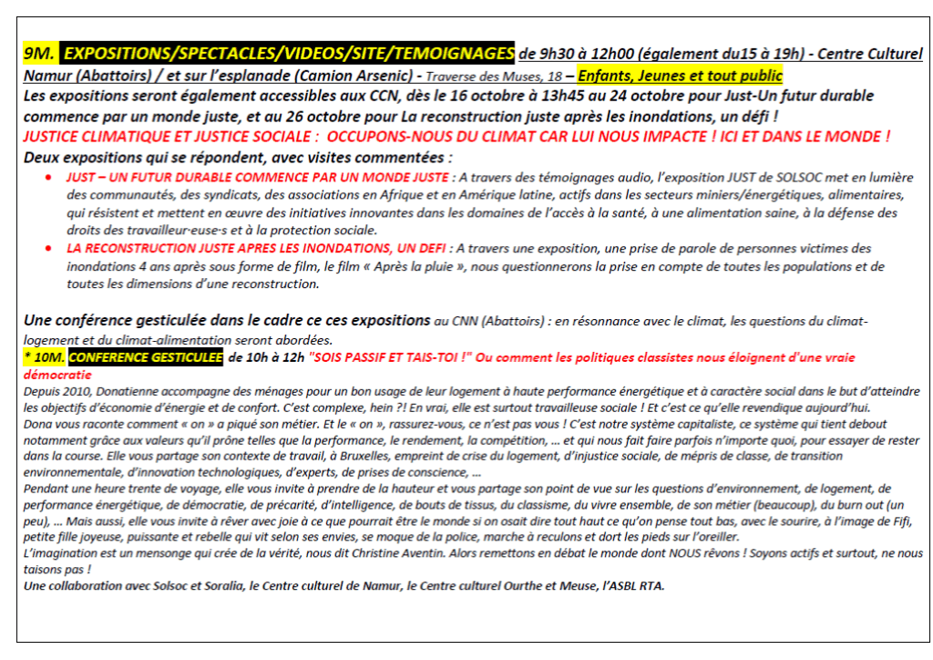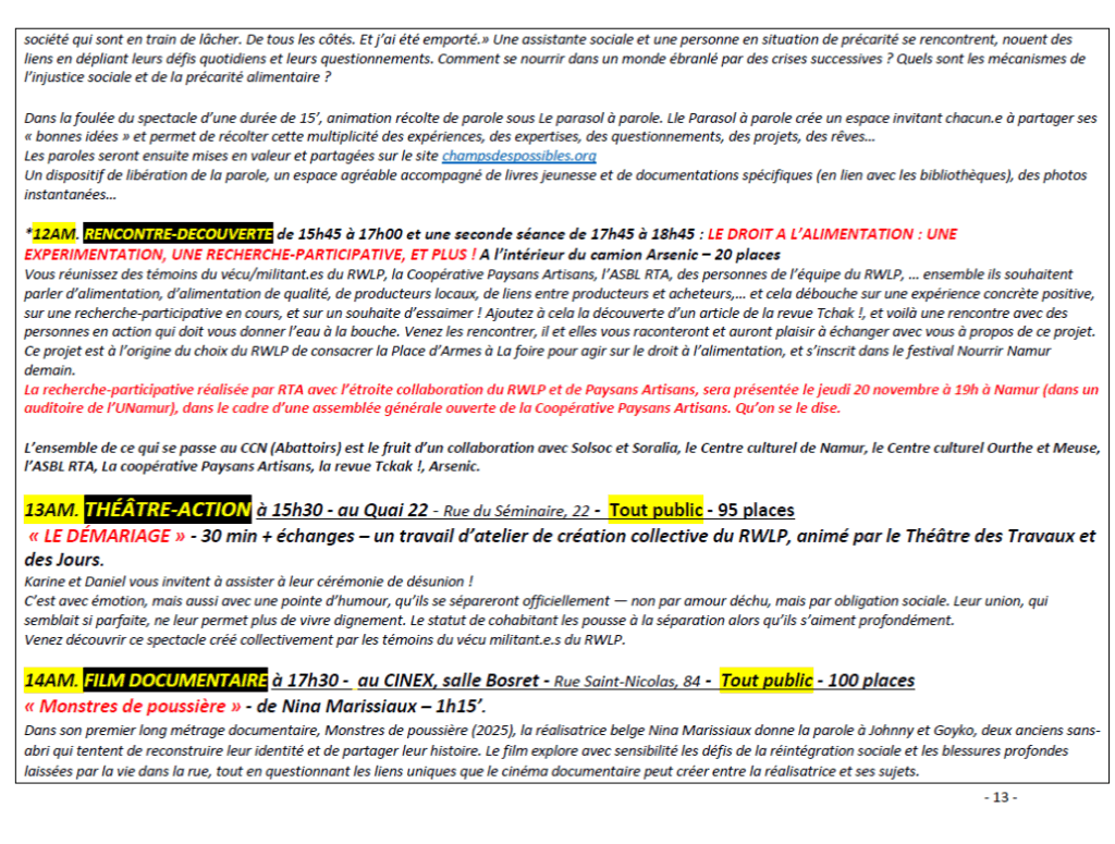 - En matinée, entre 9h30 et 12h15 : un ensemble d’ateliers, conférences-débats, expositions films et spectacles débats, ainsi que la prise de parole des témoins du vécu/militant.es sont organisées dans plusieurs salles et lieux à Namur.