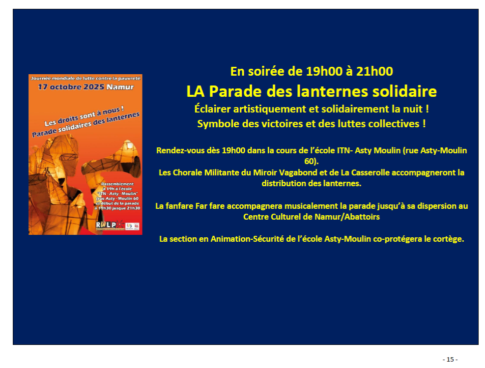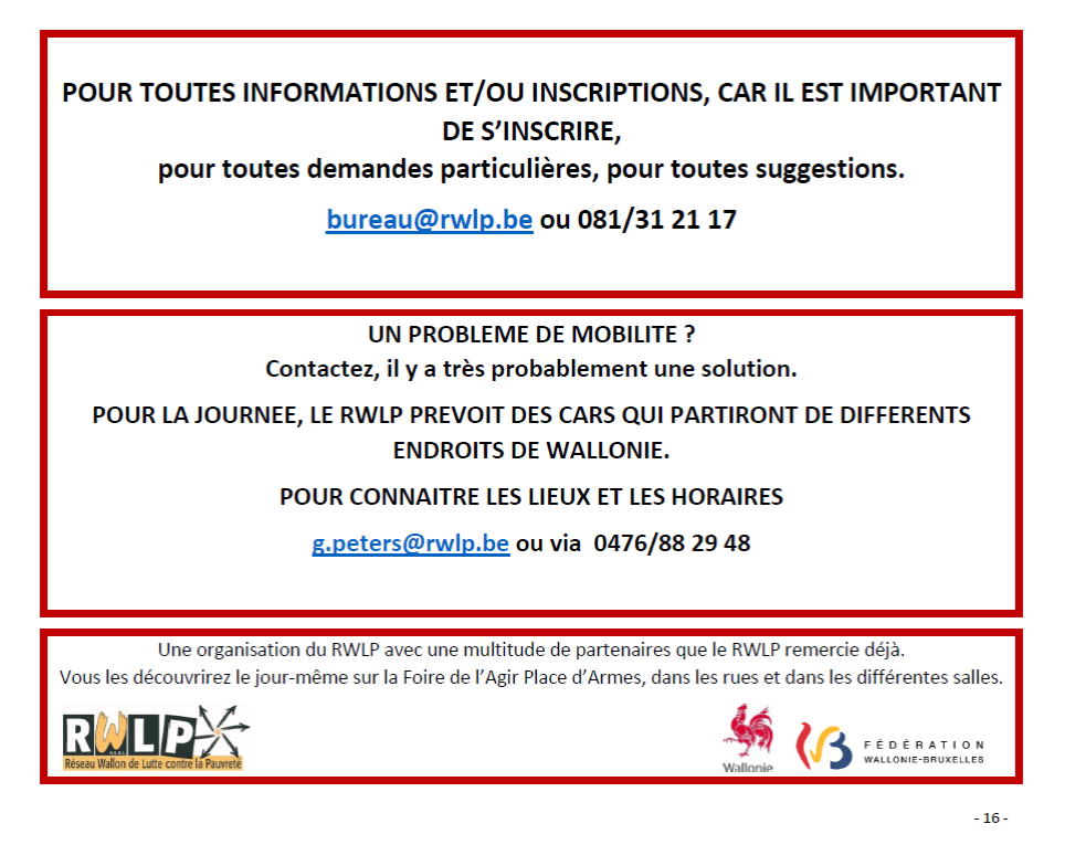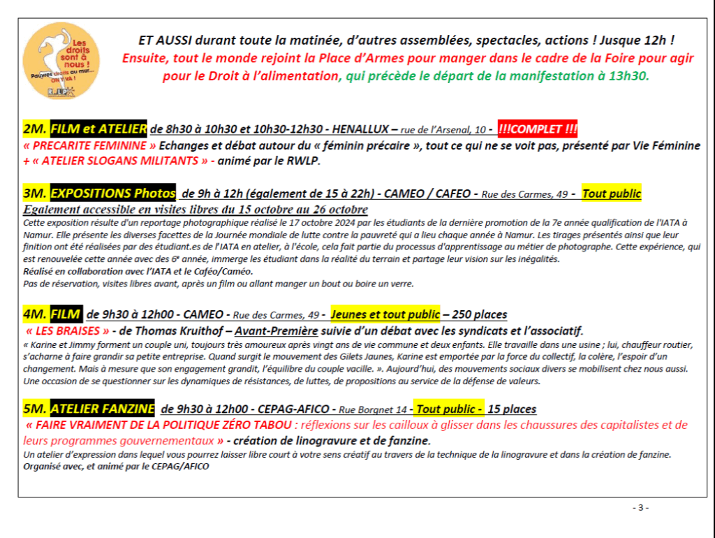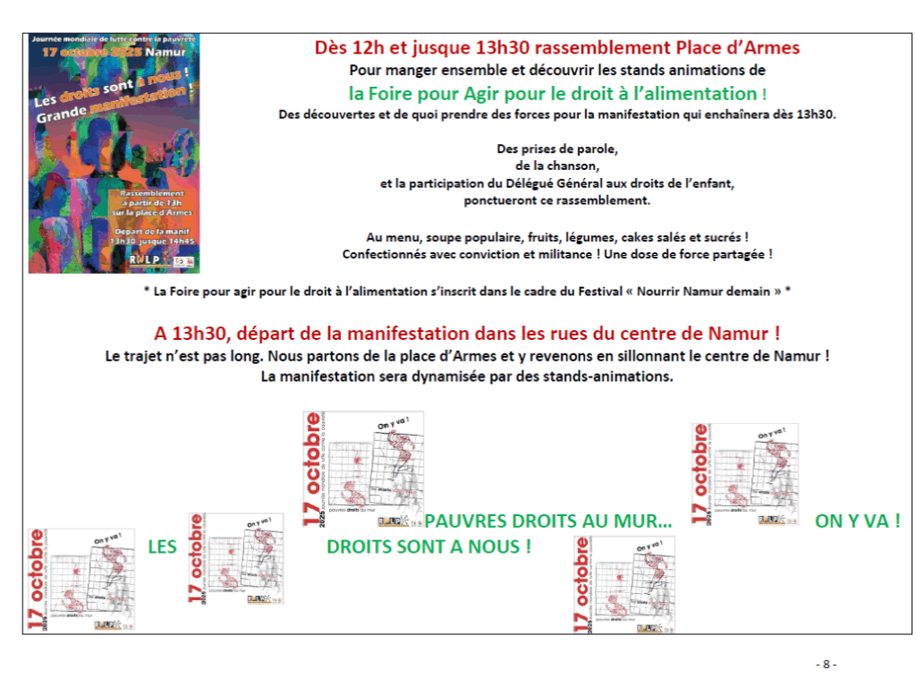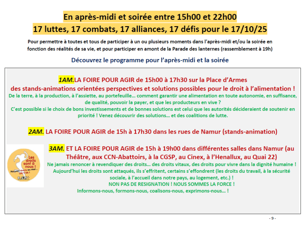 - Vous l’avez compris, il est important d’être très nombreux pour la manifestation (13h30-15h) dans les rues de Namur, sans pour autant réduire l’intérêt pour les actions tout au long de la journée et de la soirée.