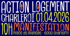 - le mercredi 1er avril à Charleroi (place du manège) de 10 à 12h, pour une manifestation dans les rues avoisinantes suivie de prises de paroles, pour fêter les fausses bonnes nouvelles dans l’actualité logement, en particulier sur le logement public (cfr La Sambrienne) et l’insalubrité.